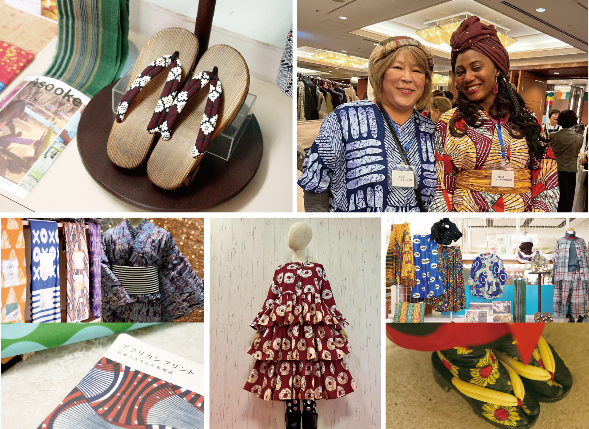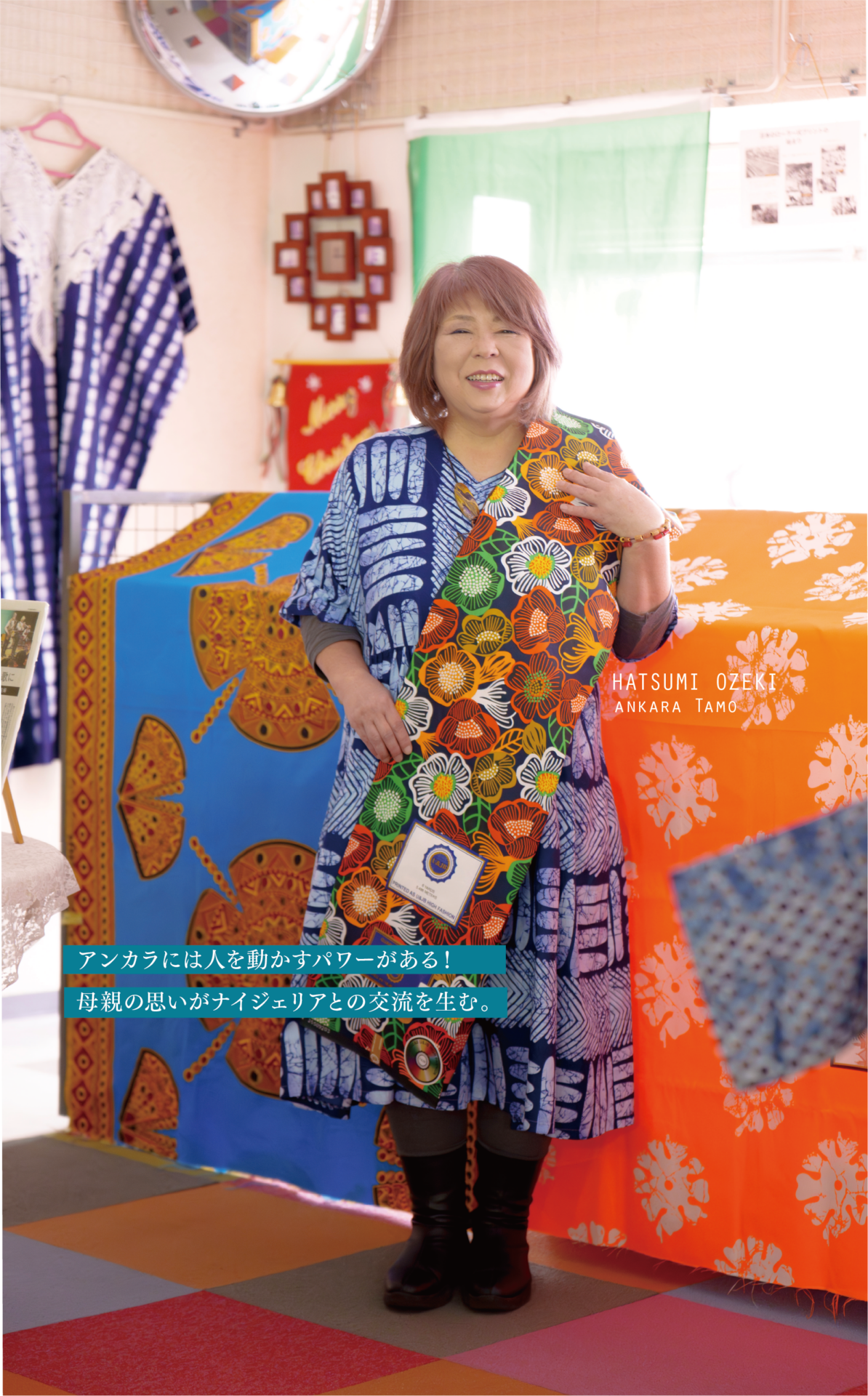 「私には一人息子がいて、彼に日田の楽しそうな生活を見てもらうためにSNSを始めました。いつか日田に帰って来てもらいたいと思って(笑)。でもそれらの投稿が届いたのはナイジェリアの学生でした。食事をしている動画に『日本のお箸でご飯を食べてみたい』というコメントがきたんです。そう言えば頂き物の日田の竹箸がある!と思い、彼に送りました。住所は彼の通っている大学でした。そのお礼にとナイジェリアのアクセサリーとインスタントラーメン、そしてお手紙が綺麗な布に包まれて送られてきたんです。その布が今現在私が取り扱っている『アンカラ(ナイジェリアの模様布)』でした。なんだか懐かしい感じがして素敵だと思いました。彼に布のことを聞くと、お金を送ってくれれば購入できると言われ、騙されたかなぁ?と思いながら一万円を送金しました。そうすると3ヶ月後に素敵な布が2枚届きました。それをまたSNSで投稿したのをきっかけに余田先生という京都の龍谷大学の教授とのお付き合いが始まりました。私自身も色々勉強してみると、過去に日本の紡績工場がナイジェリアに技術を伝えたという歴史があることや、60~70年代に京都でつくられたアフリカンプリントが現地へ輸出されていたことを知りました。余田先生が一緒にお話を聞こうと京都工芸繊維大学に連絡を取ってくれました。そのためにはと、まずは地元新聞さんでポスティングのバイトをして、5万円貯めてまた布を買い、それを繰り返して、京都に行きました。そこで得たのは、アンカラと共にナイジェリアと日本の紡績にまつわることや私の経験などを伝え広める活動をするということでした。そして2023年に『アンカラTamo』を発足。私は縫製はしないので、できる人を探して洋服にしたり、日田の月隈木履さんに協力していただき、日田杉の下駄の鼻緒にもしました。東京での初めての販売時に特に日田下駄はお客様にとても喜んでいただいたので、自信にも繋がりました。東京では更に色んな方との繋がりができ、私の話に感動・共感をしてくれる方とのお付き合いが今も広がっています。」