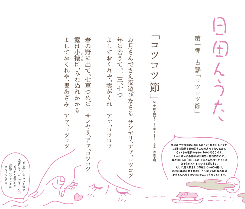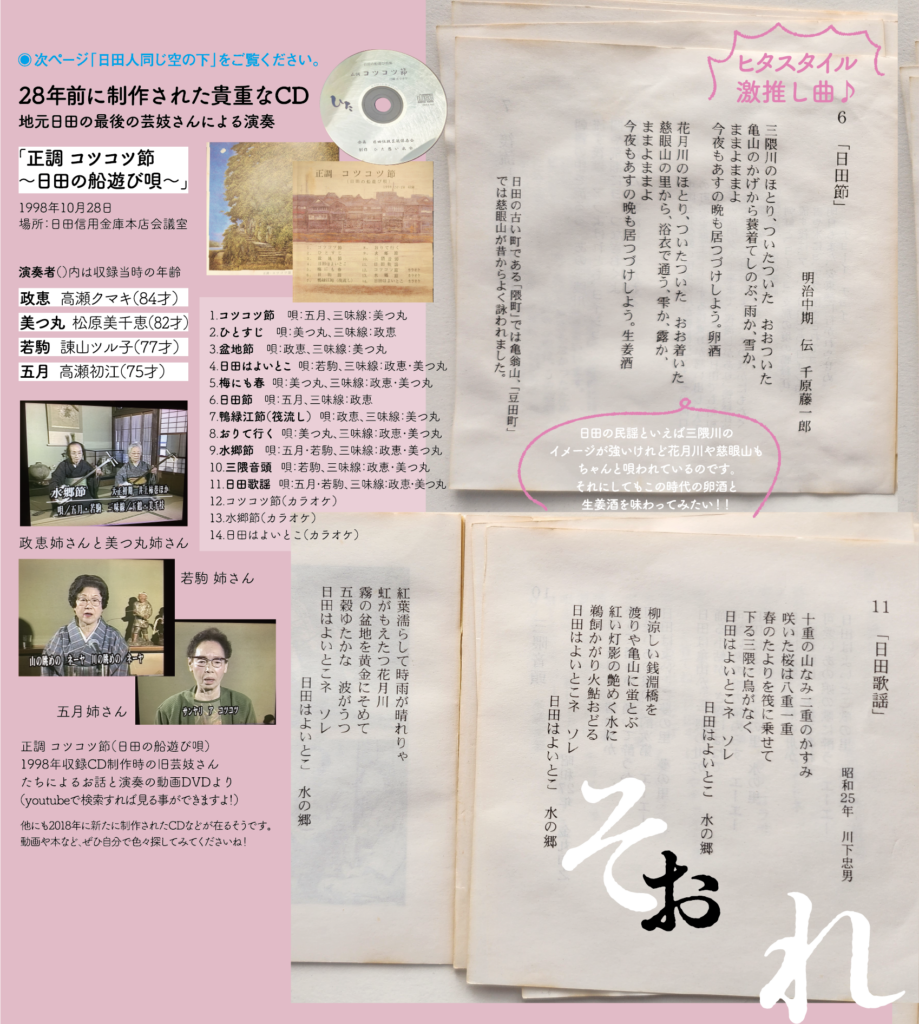 情報過多のSNSや動画の世界で「短さ」が必須事項となっている今なら、日田祇園囃子のレパートリーにも存在する民謡の「端唄」などは特に拡めるチャンスなのかもしれません。次ページに紹介した「おりて行く」など、こんなにも短く簡潔なのに最高にカッコイイ一曲です!分かり易い説明と答えが即刻求められるこのAI時代に、面倒くさい「口伝」の民謡世界の醍醐味は、分かり易さとは真逆の、相手の内面をも聞き取る自らの「洞察力と想像力」そして「謎を謎のまま保持出来る能力」の必要性と、いつの時代もそれを人間が失ってはならないという事を改めて教えてくれます。そんな、ネットの中では得られそうにないものをネットきっかけで知ってしまったような…少々複雑な気分ですが、お陰でネットの外(そと)にある民謡の奥とその周りのこと(唄も踊りも楽器も全て)をもっともっと知りたくなりました。人の歴史と暮らし・生き物・自然…この世の森羅万象が盛り込まれている民謡の世界を、もっと!!