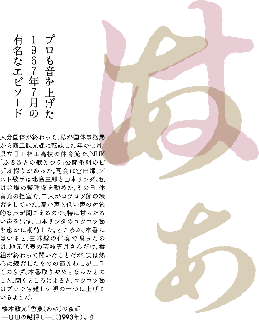 大分県は由来、小藩分立の関係か、全国的に歌われる民謡が生まれてきていないようだ。県代表をしいて挙げるならば、盆踊りとしては洗練されて大衆動員参加の出来る「鶴崎踊り」に、五木の子守唄以上の独自性のある「宇目の歌けんか」それに俚謡、小唄のお座敷唄「コツコツ節」ぐらいのものではあるまいか。