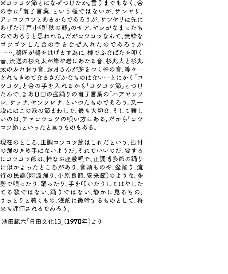 かつて映画の取材に日田に来遊した、映画監督の山本嘉次郎さんは、此のコツコツはええ歌だ、どこかに江戸小唄の名残りがあって、流石に天領日田の面影をしのぶことが出来るといって、口三味線で膝を軽く叩いて微吟しておられた。作家大仏次郎先生に、三隈川の遊船で、コツコツ節と祇園囃子を披露したところ、池田さんやええ歌じゃないか、ええ囃子じゃ、日田天領時代の名残りといえば、こんなもんじゃないかな、大切に保存しなされやとはげまされた。