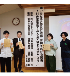 やっぱり木っておもしろい。そう実感した2月21日、木が大好きな方々と出会ったからだ。この日は、ひた森の担い手づくり協議会の主催する第5回ひた森講演会が行われ、株式会社モリアゲの長野麻子さん、髙村木材の髙村真志さん︵父︶と一緒にゲストで登壇した。大勢の人を前にうまく話せるかとても緊張して当日を迎えた。スライドや話す内容を考えて本番を迎えたが、思っていた以上に緊張しなかった。フリーペーパーや木レンジャーなど、これまでの活動で話したいことがたくさんあったが、あまりメモを見らずにスラスラと話すことができた。長野さんの話はとても面白く、山の現状や森林の良さ、関係人口を増やす重要性をとてもわかりやすく理解できた。話を聞いていると、どんどん引き込まれてとても山に行きたくなった。トークセッションでは、ゲストみんなで意見を交わし、自分の思いも話すことができた。